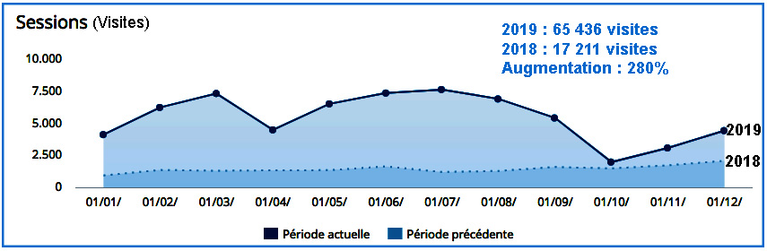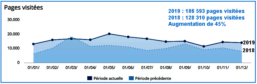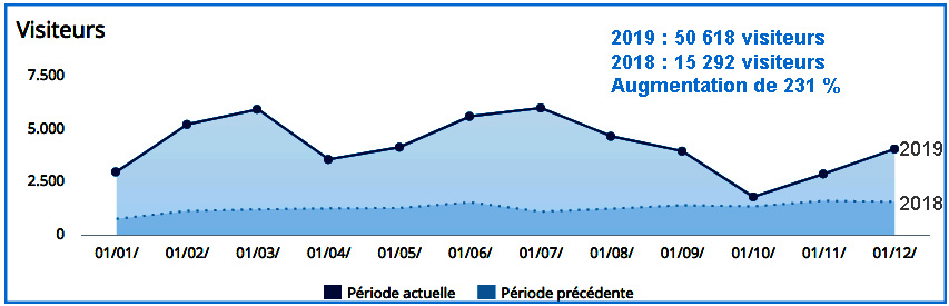 On constate une nette augmentation de la fréquentation du site internet, 231 % pour les visiteurs et 280 % pour les visites. Si le nombre de visites reflète bien l’augmentation de la fréquentation, le nombre de visiteurs est plus délicat à interpréter car il dépend de la connexion et du nombre d’appareils différents utilisés (ordinateur, téléphone, tablette) par un même individu pour se connecter.