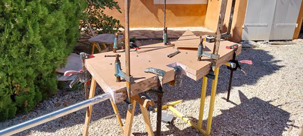 Les deux faces sont superposées et pressées fortement avec des serre joints à pompe. Temps d’attente sous presse : 24 heures. Passé ce délai, nous desserrons les presses.