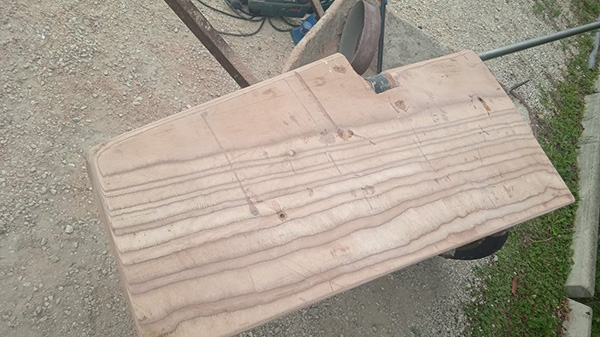 Commence alors le façonnage de la pelle. Les plans nous donnent les profils des épaisseurs. Nous gravons des rainures qui nous vont servir de traits de cotes, puis au rabot électrique on s’approche des fonds de rainures pour finir à la ponceuse à bandes. Malgré un bon outillage ce travail est long car nous avançons « molo » pour ne pas nous tromper. Le chantier est installé chez Marcel, le mieux outillé de nous tous. De plus, il passe un temps considérable sur cette pièce qui prend forme. Mardi soir, nous quittons le chantier chez Marcel, j’embarque le safran pour opérer la finition chez moi, à Bouc Bel Air. Après quelques finitions nécessaires, du ponçage essentiellement, mercredi, je passe la première couche de résine epoxy étanche. Jeudi après séchage, je ponce légèrement et passe la deuxième couche qui est sèche le lendemain. J’en profite pour faire un chariot de fortune pour transporter la nouvelle pièce qui, avec l’outillage et les pièces de remontage, est assez lourde..