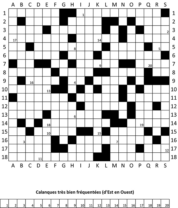 A – Un des frères du 1 horizontal – Levant ou Orient – Le naufragé volontaire. B – Rarement posés sur les hublots – Comme le temps en mer, parfois – Se dit d’une pluie intense et serrée. C – Prénom du capitaine de l’Océano Scientific – Navigateur lancé sur les traces de Cook – Île des Cyclades. D – Comme des filets d’anchois dans une boîte – Anagramme de Baumes – Véhicule militaire en tête à queue. E – Oscar Sierra – Pas vraiment le style d’Onassis, même sur son yacht – Unité monétaire d’un pays traversé par Marco Polo. F – Anagramme du dieu romain des mers – Comme les fruits de mer, par exemple – Pas utile pour démarrer le moteur du bateau. G – Mer démontée – Lima Echo – Récifs coralliens du Sud au Nord. H – Quartier Maritime de Méditerranée – Tango Oscar – On ne connaîtra jamais celui du capitaine – Vitesse résiduelle d’un bateau – Quartier maritime de l’Atlantique. I – Navigatrice britannique anoblie par sa Reine – N’a pas besoin de chaise pour monter au mât – On en donne quand on choque. J – Garde-robe du naufragé – Photographe danois, vagabond du continent américain – Île du Pertuis d’Antioche. K – Anagramme d’un fleuve « qui s’en va vers la mer en passant par Paris » – Championne des embrassades. L – Une petite embarcation suffit pour y naviguer – Pour interroger ou s’esclaffer. M – En sortant de plongée ou d’épidémie – Hauts fonds redoutés par les marins. N – Opposés sur la carte – Crus recommandés pour les baptêmes civils, religieux ou maritimes – Prénom d’une chanteuse américaine de jazz qui nous a quittés en 2003 à Carry Le Rouet. O – Besoin éprouvé par les marins perdus en mer – La HF du citoyen – À Cavaillon, c’est le cantaloup. P – Le confinement y durait souvent plus longtemps qu’au Frioul – Monnaie d’or embarquée sur les galions – Pour fêter les victoires (avec modération). Q – Celui de Colomb est un modèle de simplicité – Au soleil, sur la plage de L’Arène ou de la Dugue – Loïck pour Bruno et Stéphane – Equipement en cas d’épidémie. R – Ne navigue pas sur un cageot ni sur une poubelle – Proue du France – Matériau utilisé par Tabarly pour son Pen Duick 600 – Quartier maritime de l’Atlantique. S – Quatre ont suffi pour annoncer le débarquement – Sierra Uniform – Habitante de l’île de Milo confinée à Paris – Région au régime sec.