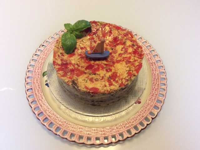 Posez une première omelette, soit dans un moule à charlotte, soit dans un plat rond (si possible du diamètre des omelettes). Continuez ainsi en alternant parfums et couleurs, jusqu’à obtenir un gâteau assez haut (comme une charlotte aux pommes).